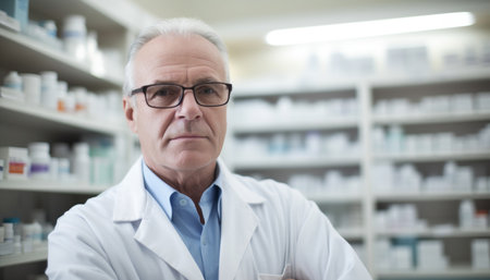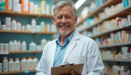 A cheerful elderly man in a white lab coat stands confidently in a pharmacy, surrounded by shelves filled with colorful medicine bottles. His warm smile and approachable demeanor convey trust and expertise, making him a reassuring presence in the healthcare environment.