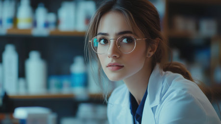 Young female pharmacist wearing glasses and lab coat working in pharmacy