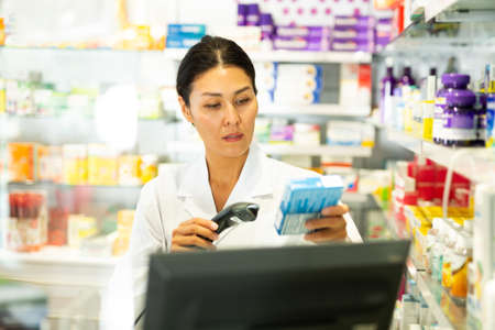 Portrait of female pharmacist working at the cash register in pharmacy - scans barcode on medicine package
