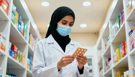 muslim pharmacist in face mask holding pills in pharmacy drugstore