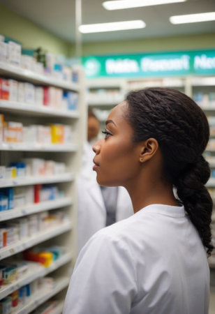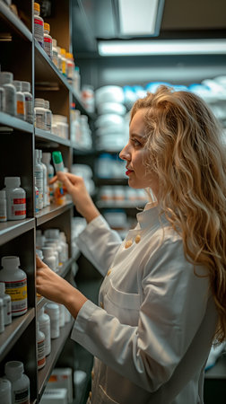 A female pharmacist in a modern pharmacy, organizing and managing medications on the shelves, looking focused and professional.