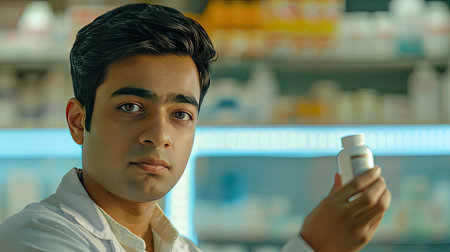 Confident pharmacist standing in pharmacy, holding medicine generated by artificial intelligence