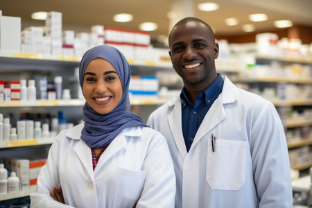 Pharmacy worker assisting customers with medications in a well-organized drugstore during the daytime