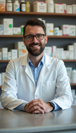 A confident male pharmacist with glasses smiles warmly while seated at a pharmacy counter, surrounded by shelves of medication. His approachable demeanor and professional attire create a welcoming atmosphere, emphasizing trust and expertise in healthcare.