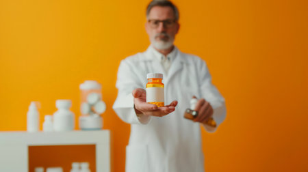 Senior male doctor with stethoscope holding a medication bottle in front of orange background. Pharmaceutical care and health concept.