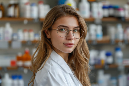 A confident female pharmacist wearing glasses and a white coat, standing in a pharmacy aisle filled with medication bottles, exuding professionalism.
