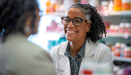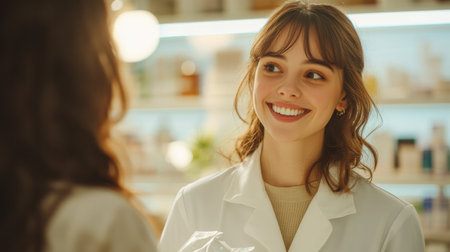 Friendly female pharmacist in a white coat interacting with a customer in a bright, well-organized pharmacy environment.