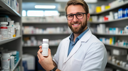 Smiling pharmacist holding medication bottle in modern pharmacy setting, shelves in background