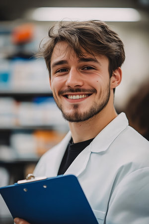 Smiling Pharmacist With Clipboard in Pharmacy Healthcare, Dispensary, Medical Profession