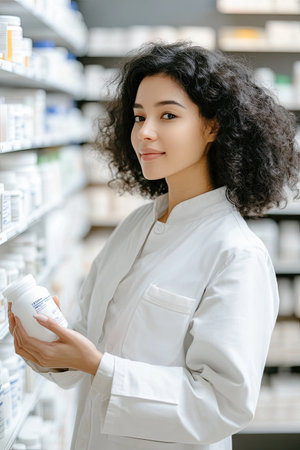 A cheerful beautiful smiling African-American female pharmacist with curly hair, standing next to the pharmacy shelves
