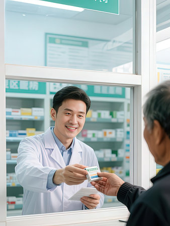 pharmacist and customer in drugstore. asian male pharmacist showing medicine to customer