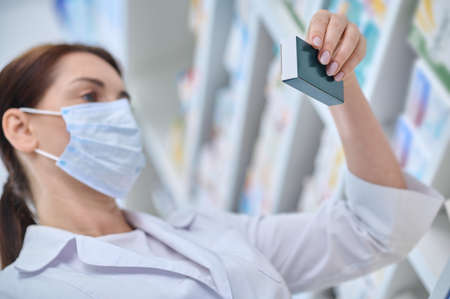 Pharmacist woman carefully examining packaging of medicine