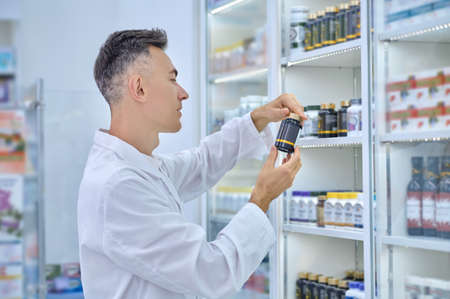 Drug store. Serious young male person wearing white gown while doing inventory