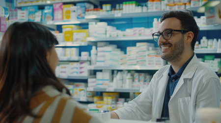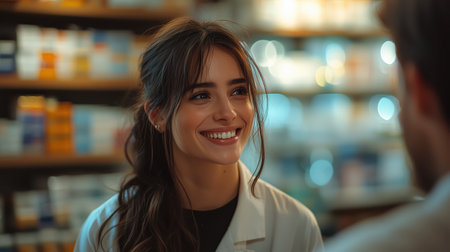 A hyper-realistic photo capturing a female pharmacist warmly smiling while interacting with a customer in a modern pharmacy environment. The image conveys professionalism and friendliness.