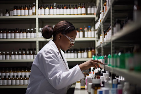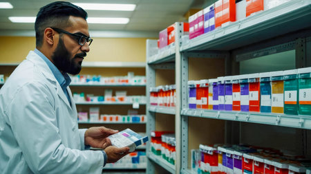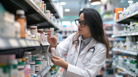Pharmacist inspects a well-organized inventory of medications in a pharmacy, ensuring accuracy and quality control in the healthcare setting.