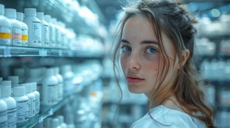 A young and pretty woman wearing a white doctor's coat is pictured against a blurred background of shelves filled with medical supplies. illustration created by Generative AI