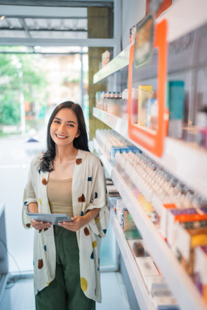 Asian young woman pharmacist with a lovely friendly smile pick capsule medicine and looking at camera in the pharmacy drugstore. Medicine, pharmaceutics, health care and people concept.