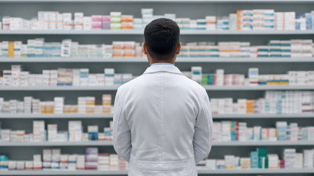 A young pharmacist with dark hair stands in a drugstore. Behind the pharmacist, shelves are stocked with many kinds of medicines and health items. The setting shows a busy pharmacy.
