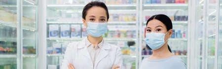 pharmacist in medical mask standing near asian customer in drugstore, banner