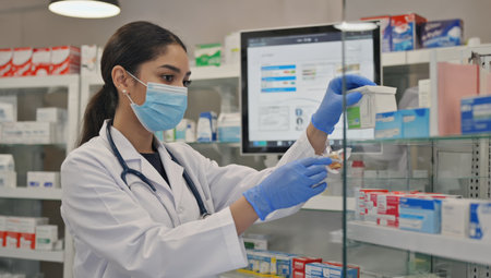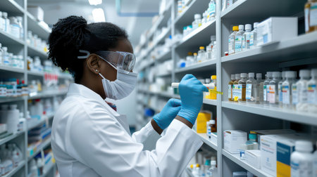Female pharmacist wearing medical mask, gloves, and white coat, organizing medicine boxes on pharmacy shelf, representing healthcare safety, pharmaceutical worker, and modern clinical environment.