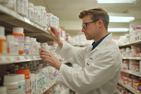 A pharmacist in a white coat carefully selects medications from a well-stocked pharmacy shelf. This image represents healthcare, pharmaceuticals, and professional care.