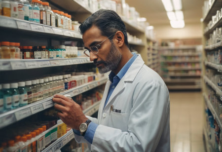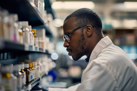 A man in a lab coat is looking at a shelf of medicine bottles. He is wearing glasses and he is focused on the task at hand. Concept of professionalism and attention to detail