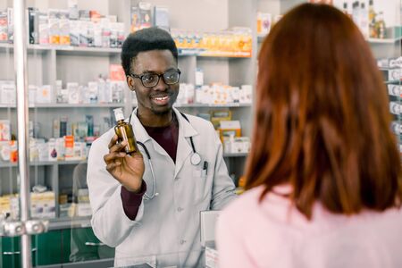 African man Pharmacist and woman client at pharmacy.
