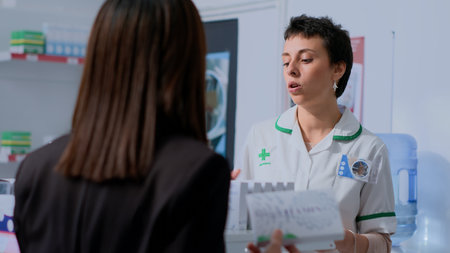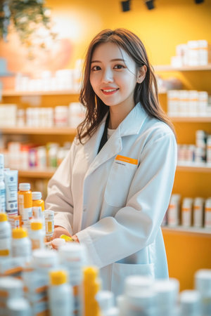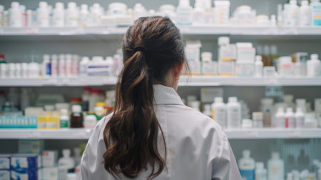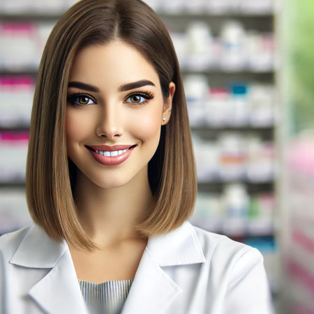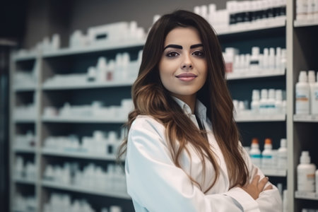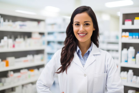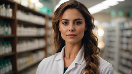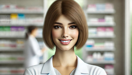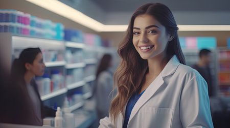 AI Generated. A female pharmacist in a pharmacy background and copyspace