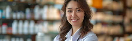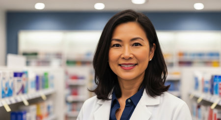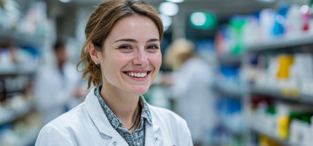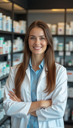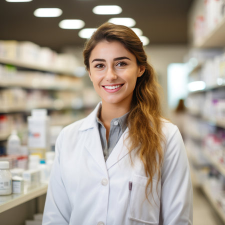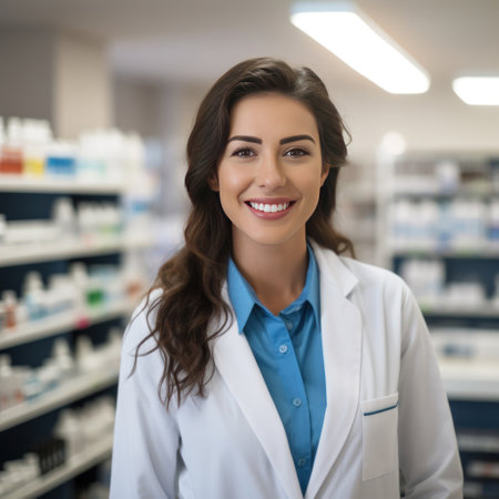 Smiling female pharmacist in white coat standing confidently in a well-lit pharmacy, representing health care and professionalism.