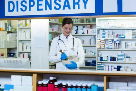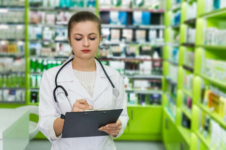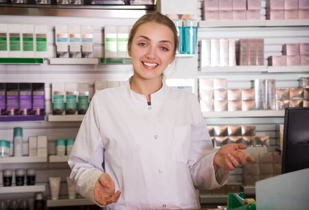 Beautiful smiling young woman pharmacist doing his work in pharmacy.