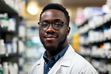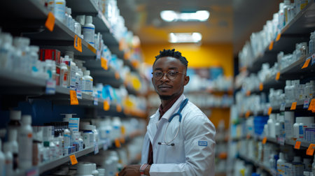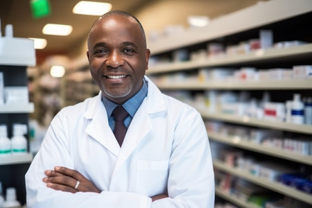Confident African American male pharmacist in a white coat posing in a well-stocked pharmacy, representing healthcare professionalism.