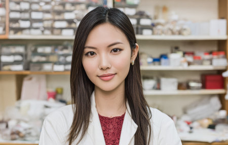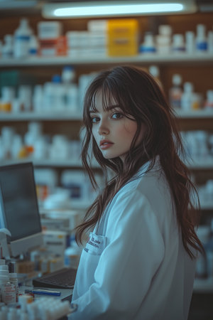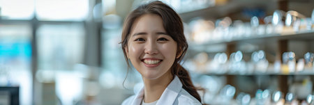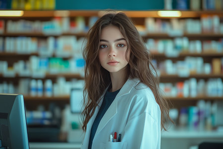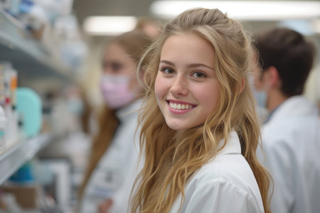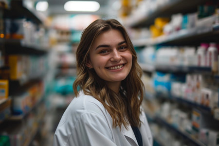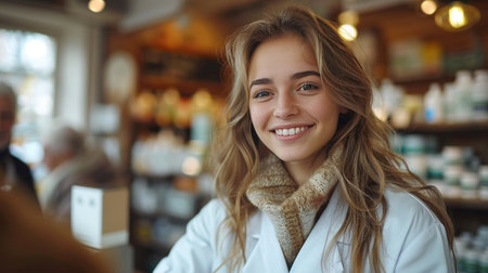 A young dental student with a radiant smile and lab coat stands in a pharmacy, her optimism reflecting the hopeful spirit of future medical professionals. A.I.