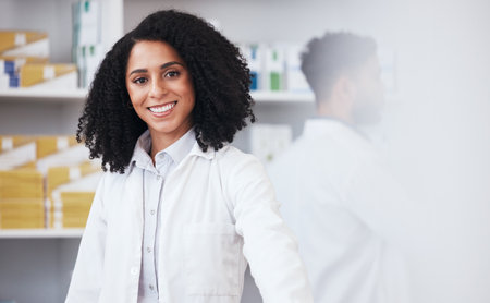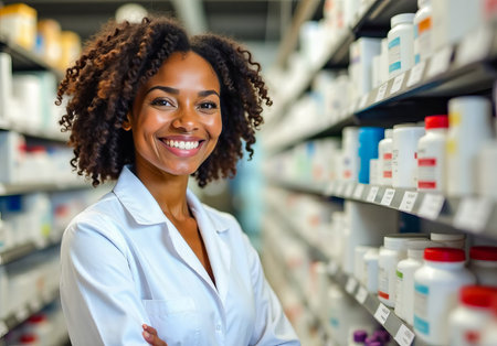 A cheerful beautiful smiling African-American female pharmacist with curly hair, standing next to the pharmacy shelves.