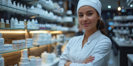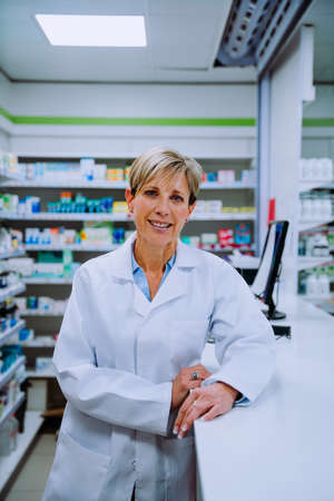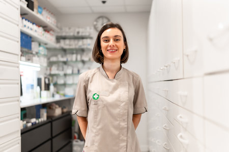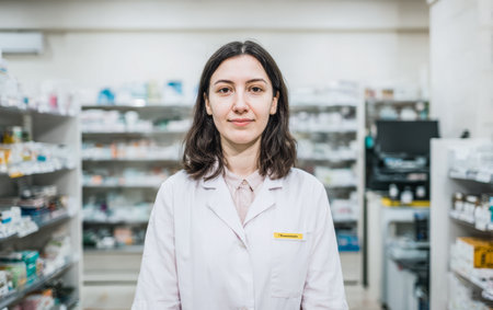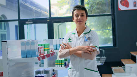 Confident female pharmacist stands behind counter in a modern pharmacy, symbolizing healthcare, trust, and professionalism in medicine.