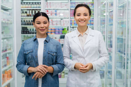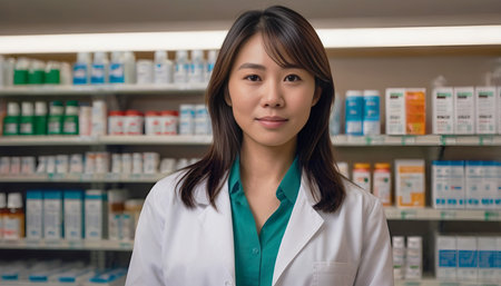 Portrait of an Asian female pharmacist in a white coat against the background of shelves with medicines in a drugstore. Close-up.