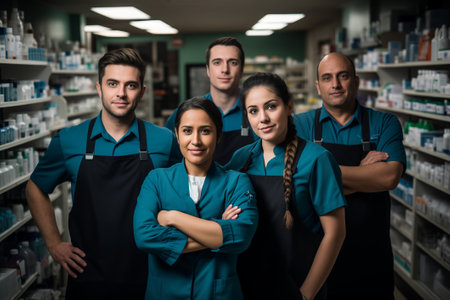 Diverse group of professionals in white lab coats standing in front of shelves in a pharmacy