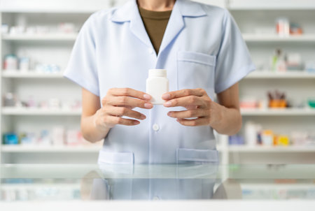 Close up woman hands holding medicine bottle near drug shelves. Pharmacist checks inventory of medicine in pharmacy drugstore. Professional Female Pharmacist wearing uniform