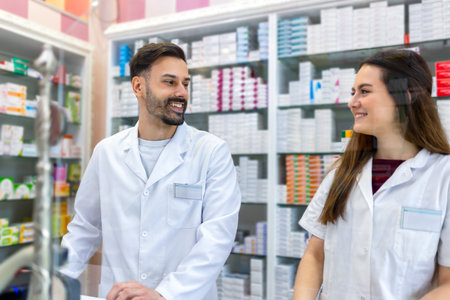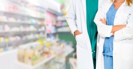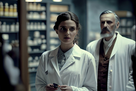 Pharmacists in drugstore healthcare and medical concept two doctors. Ai generated illustration.