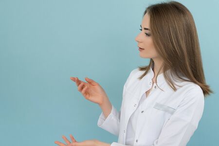 Pharmacy and medicine. A brunette woman with long hair, in a medical gown with a smile takes out medicines from a locker in the storage room.