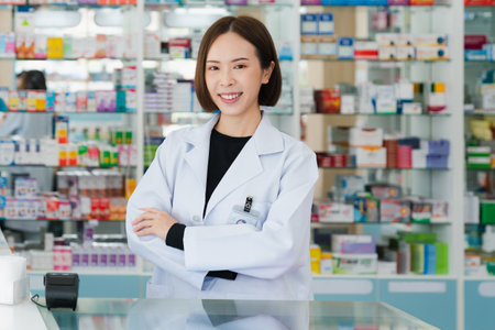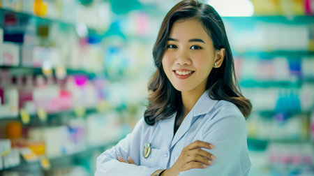 Portrait of beautiful professional Thai female pharmacist, crosses arms and looks at camera smiling.