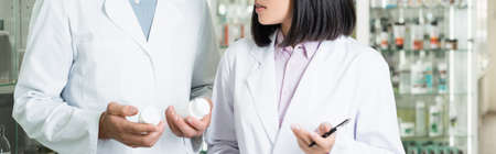 cropped view of pharmacist in white coat holding bottles with medication near colleague in drugstore, banner