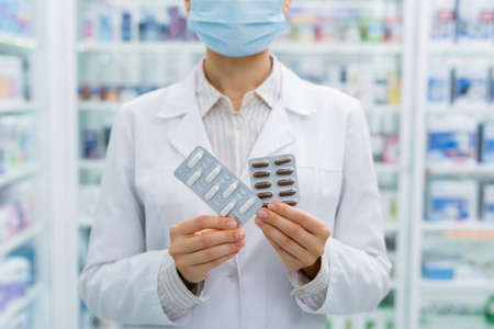 Asian young woman pharmacist with a lovely friendly smile pick capsule medicine and looking at camera in the pharmacy drugstore. Medicine, pharmaceutics, health care and people concept.