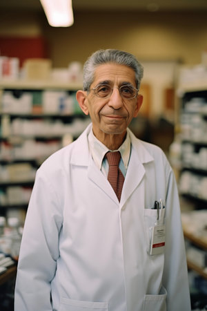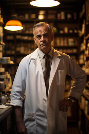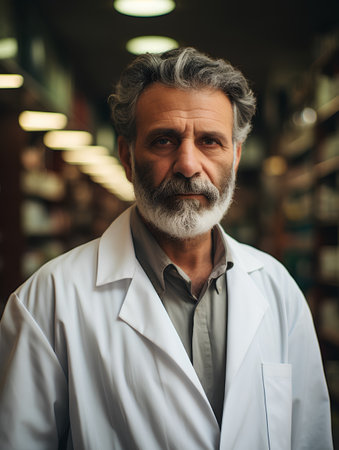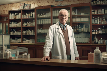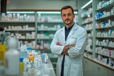 Portrait of a male pharmacist at a modern drugstore counter, showcasing professionalism and care