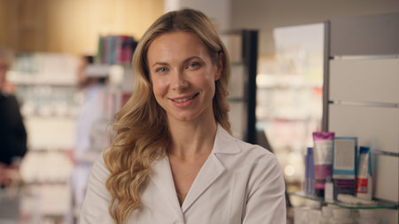 Close-up of a smiling female pharmacist inside a pharmacy. Shelves with medication and healthcare products in the blurred background.