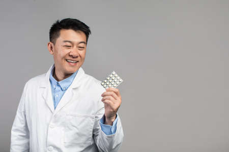 Happy adult asian male doctor in white coat holding pills isolated on gray background, studio, free space