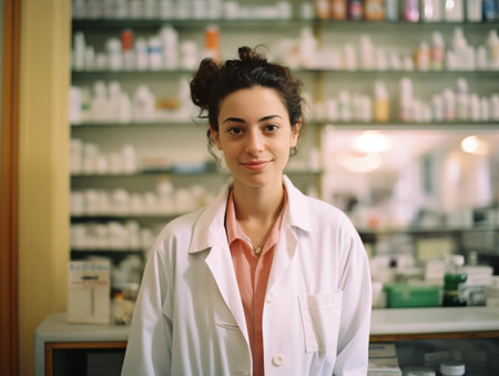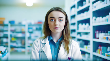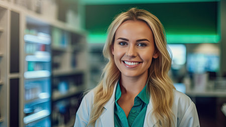 Portrait of beautiful young woman pharmacist in white coat standing in pharmacy, Generative AI