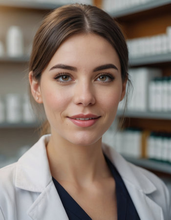 A young and pretty woman wearing a white doctor's coat is pictured against a blurred background of shelves filled with medical supplies. illustration created by Generative AI