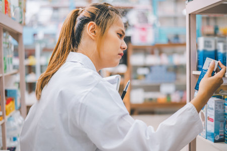 Pharmacist checking Checks Inventory of Medicine, Drugs, Vitamins and prescription medication checks in modern pharmacy.