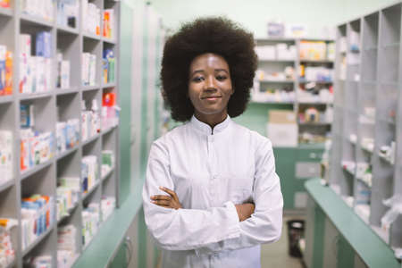 Smiling African American woman pharmacist or chemist posing to camera with arms crossed, while standing in interior of modern light pharmacy. Pharmacy and medicine concept