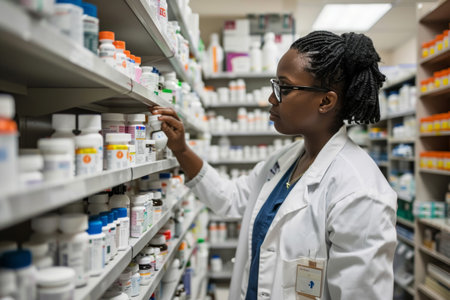 A pharmacist in a white coat carefully selects medications from a well-stocked pharmacy shelf. This image represents healthcare, pharmaceuticals, and professional care.